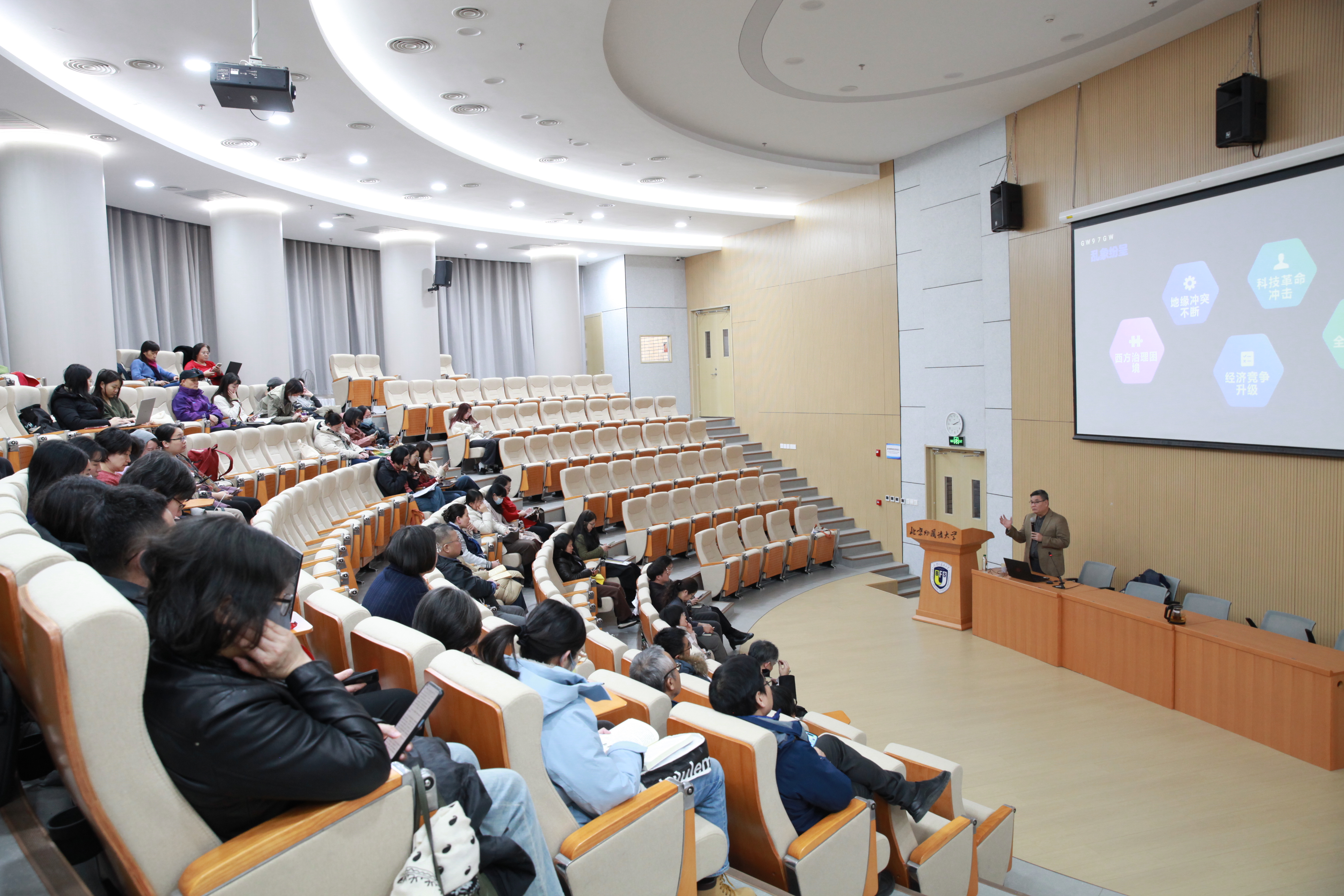 蔡芝芳书记在总结中指出,本次报告内容丰富、视野开阔、分析透彻,既是对国际形势的系统解读,也是对高校育人工作的深刻启发。她援引报告中提到的“2025年度汉字”案例,指出了“韧”字所蕴含的时代意义:“新加坡选出的年度汉字是‘荡’,而中国是‘韧’。这恰恰表明,在动荡变化的世界中,我们需要保持一种坚韧不拔的精神,坚定不移地走好自己的道路。”她强调,“韧”不仅是对当前状态的描述,更是一种应对挑战的智慧与心态。勉励全体教职工在工作和生活中时刻保有这份韧劲儿,持续深化对国际国内形势的认识,将学习成果转化为立德树人的实际行动,努力培养更多具有家国情怀和全球视野的优秀人才,在服务国家发展中彰显北外人的责任与担当。